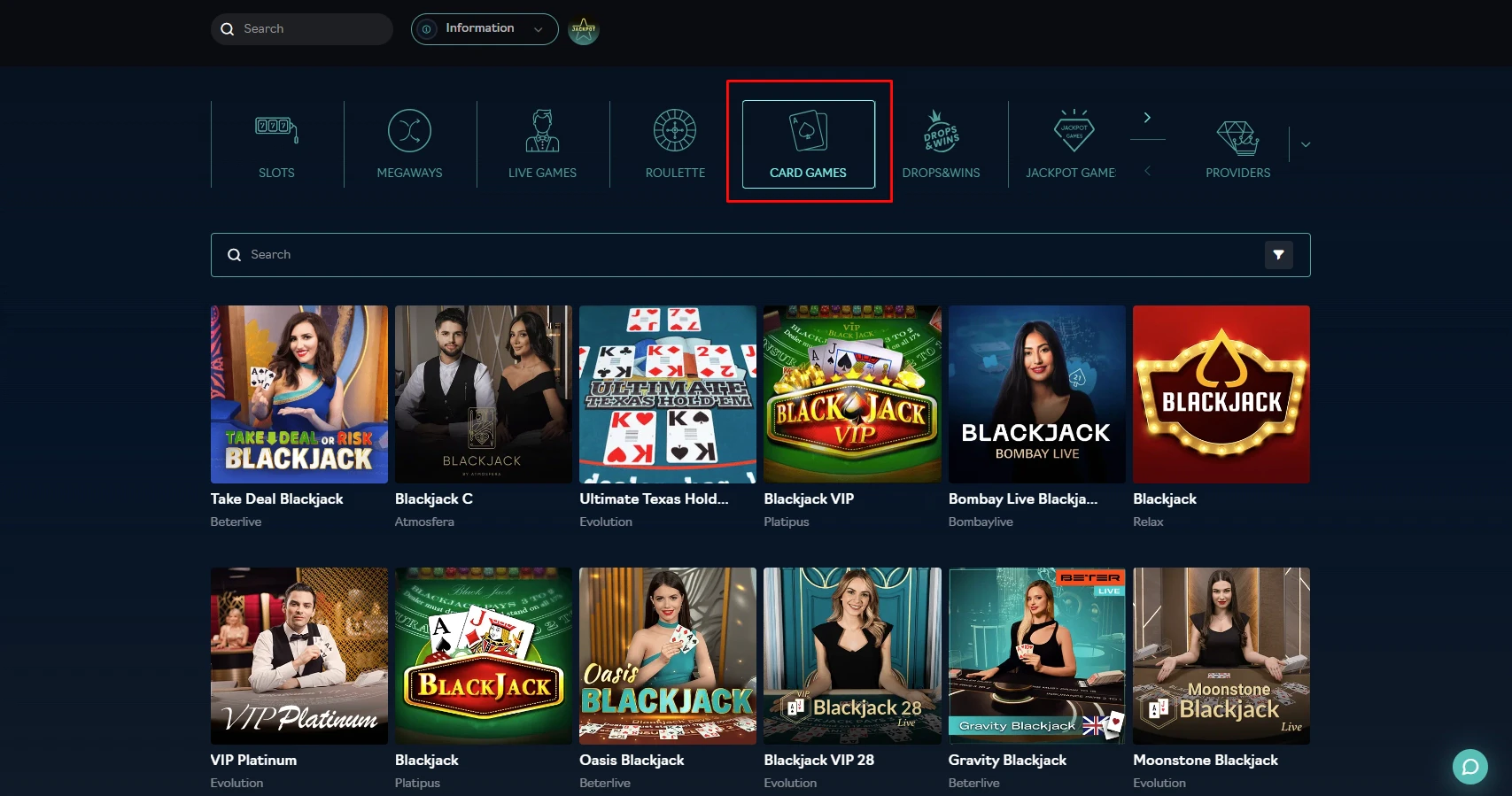 Use the handy search bar in the menu to search for your favourite ones! You can find plenty of options for Baccarat, Blackjack, and Poker, among others.