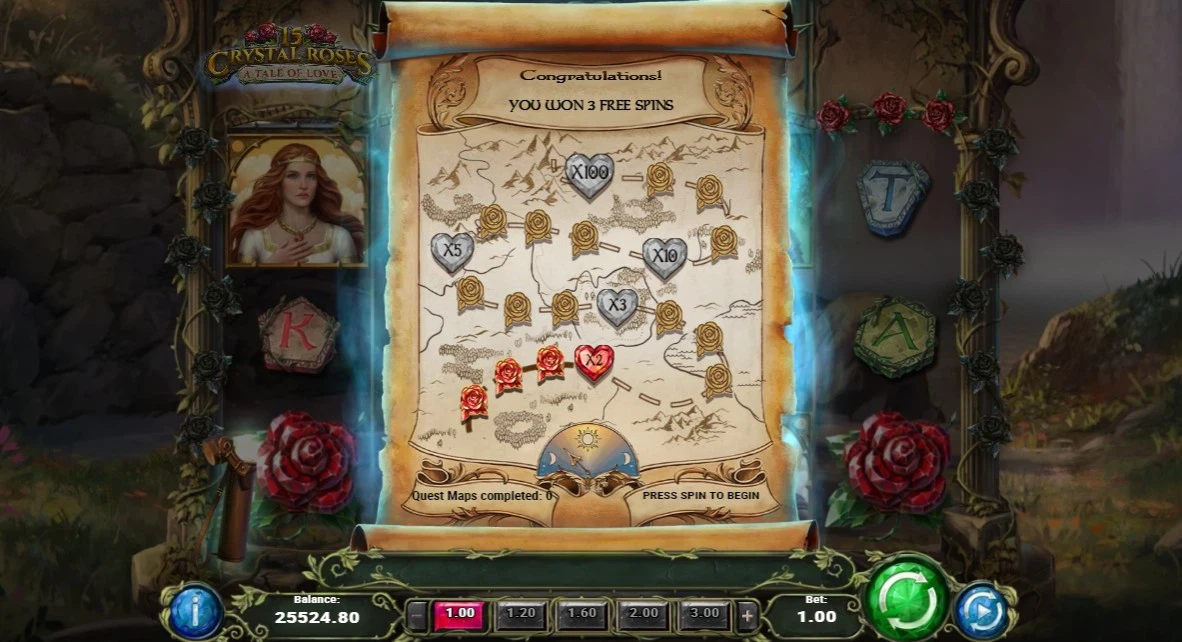 To unlock the 15 Crystal Roses A Tale of Love slot bonus feature, at least 3 Scatters are required. Once won, the bonus feature will offer you a card that can reach the heart x 100 by collecting little roses during your free spins. The multipliers can be triggered in advance if you get more than 3 Scatters, here is an overview of the number of spins and multipliers you can get: