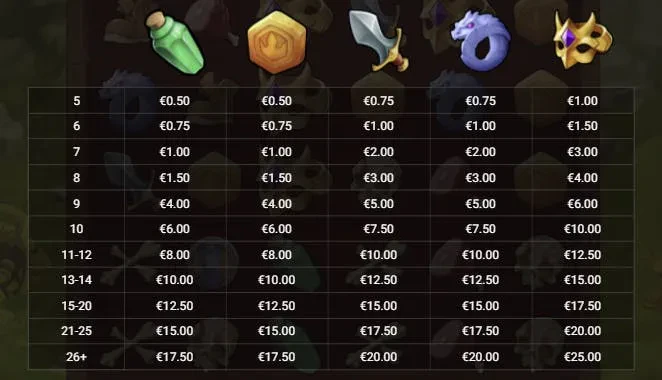 Premium symbols are the rarest and therefore pay the most. They are represented by a flask, a gold coin, a sword, a dragon and a gold mask