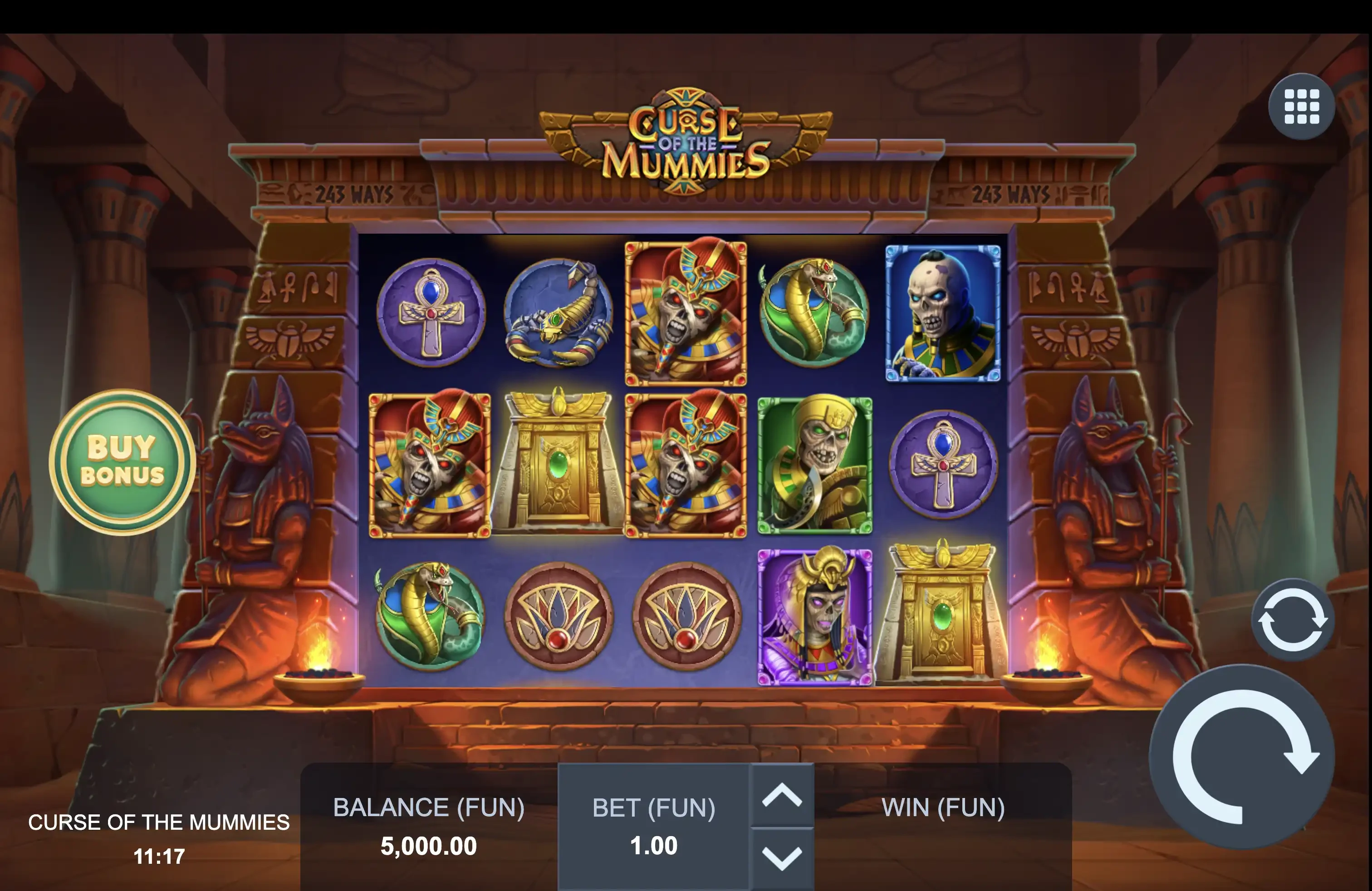 On June 14, 2022, the provider Blue Guru Games in collaboration with Relax Gaming has decided to offer a new slot machine to the players: Curse of the Mummies. When you visit this slot, you will find yourself in the heart of a tomb hidden in the pyramids of Egypt. The background of the starting grid is surrounded by huge pillars, while the starting grid is surrounded by symbols and pharaohs.