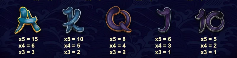 There are many symbols present in Dragon King Legend of the Seas and these are the ones that you will need to connect in order to win in this online game. The symbols all have their own value depending on their rarity. In addition, there are two distinct categories in this slot, the classic symbols and the premium symbols. Classic symbols are the most common symbols, also called common symbols. They have the lowest value and pay much less than premium symbols. On the other hand, they appear more often and make it easier to make connections. Classic symbols are represented by the highest values in a deck of cards, namely 10, Jack, Queen, King and Ace. You can see the payout range for these symbols in the following image (€1 bet).