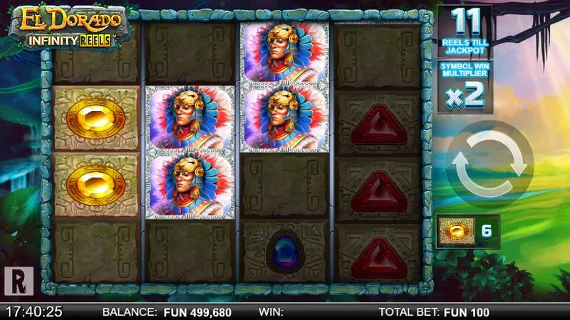 El Dorado Infinity Reels is the first slot machine to use Infinity Reels technology. And its success has allowed this innovation to be used for a large number of slots in the future. The graphics are of high quality, and great attention has been paid to detail. You quickly find yourself drawn into the depths of the Amazon in search of the golden cities. El Dorado Infinity Reels offers an excellent jackpot feature and different bonus levels with quite impressive potential. If you have the patience to collect the bonus levels or are gambling enough to try your luck at the wheel, you can start your free spins with the maximum setup!