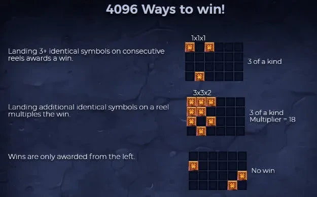 It features classic grid operation with a format of 6 vertical lines and 4 horizontal lines for 4,096 ways to win. Different symbols cascade down. They can be laid out in 2x2, 3x3 or 4x4. Symbols that are part of a winning combination are removed and new symbols appear in their place to hopefully form a new winning combination. The payout rate to Gem Rocks players is 96.2% and it can be described as a highly volatile machine with a payout of up to 9,000 times its initial bet.