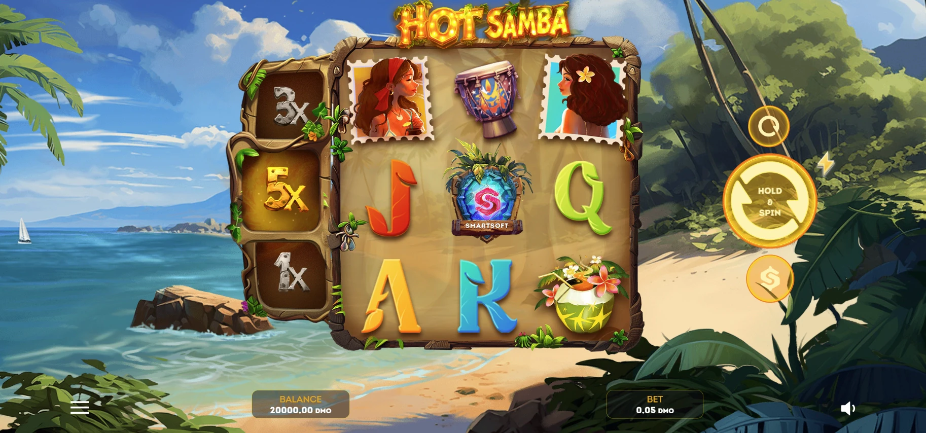 SmartSoft Gaming’s Hot Samba video slot is set on a tropical golden beach surrounded by a lush green jungle to the right and the cool blue waters of the sea with rippling waves to the left. The wooden grid in the centre of the screen is made up of three reels and three rows.