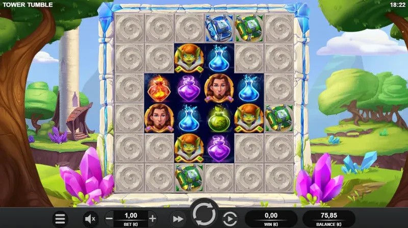 The machine comes in a 6 by 6 format, with 6 columns of 6 rows, with the 24 outermost squares of the grid being covered with spiral-shaped grey stone slabs. It features a classic grid operation where different symbols cascade down. The aim is to make adjacent connections to destroy the grey stone slabs and thus widen the possible spaces on the grid. Tower Tumble's payout rate to players exceeds 96% and it can be described as a medium to high volatility machine with a payout of up to 5,150 times its initial bet.