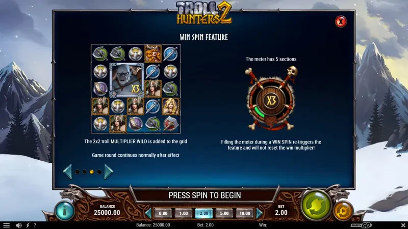 On Troll Hunters 2, there are no pay-lines. As with most cascading grids, connections are made across the grid vertically and horizontally as long as three identical symbols are next to each other. There is a load on the right side of the grid, which has three load levels. Each charge is filled with a connection of major symbols. If during a game round, all three charges are filled, one or two wilds symbols are sent to the game grid depending on the Viking shown on the right of the game grid.