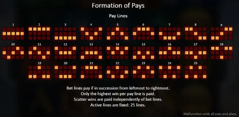 Many connections are possible on Vikings Fortune: Hold and Win. Indeed, there are 25 payment lines that you can find in the image below. Whether they are lines, diagonals or simple keys, there are many ways to win. You have to line up between 3 and 5 symbols from left to right to win.