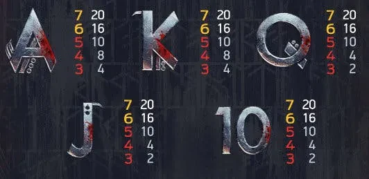 the classic symbols A, K, Q, J, 10 bloody (pay x20 for 7 identical symbols)