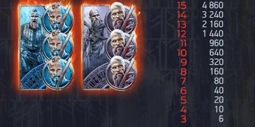 Another special feature is that roller number 3 is surrounded by a luminous halo called Hotspot. When a Viking symbol appears from head to toe on the three rows of this third reel, all the Viking characters symbols present on the grid are transformed into the effigy of the Viking represented in the Hotspot. The Scatter Pays feature is then activated and a new calculation of the winnings is performed (scale in the images below).