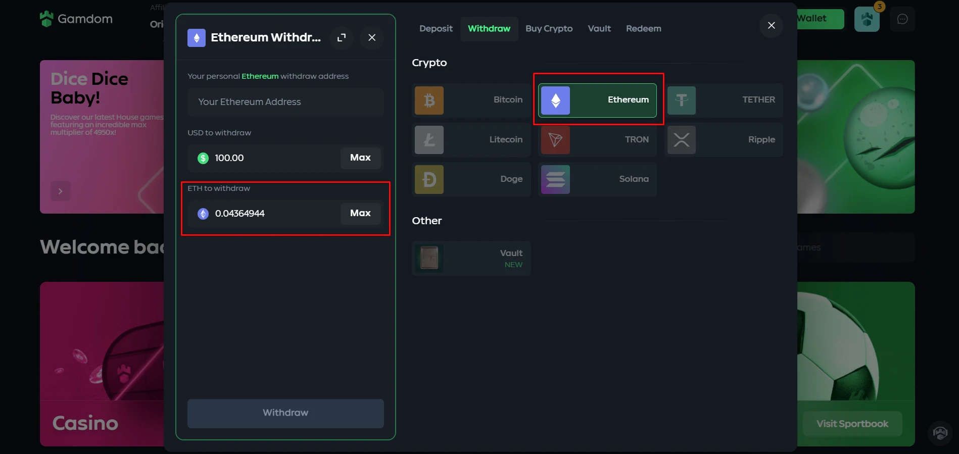 Select Ethereum: This time, hit the Withdraw option. Select Ethereum as your withdrawal method